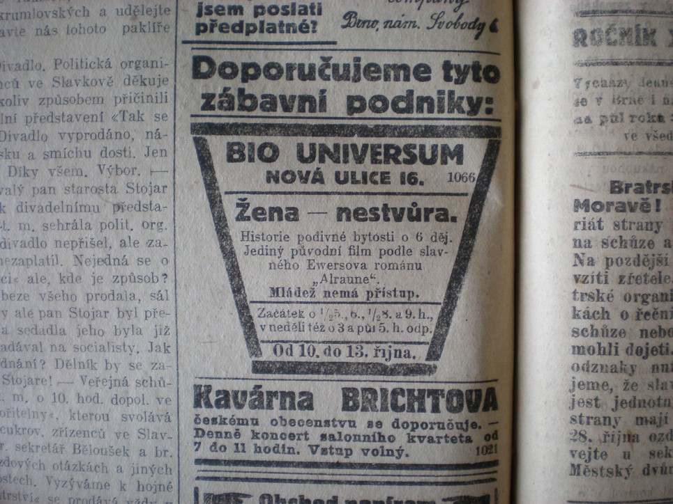 Mládež nemá přístup. Začátek o půl 5., 6, půl 8. a 9 hod. V neděli též o 3 hod. odpol.