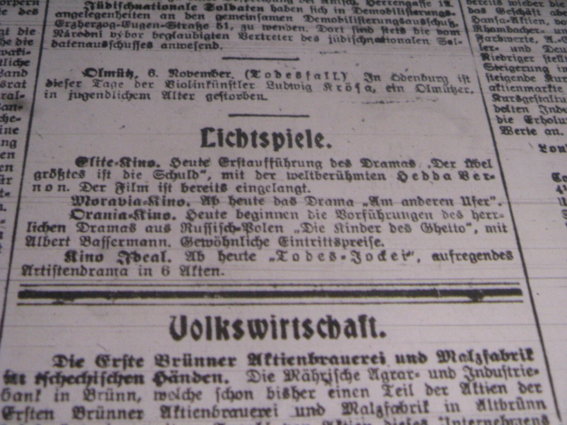 | Kino | Tagesbote aus Mähren und Schlesien | 1918-11-08 | 522 | 100 |