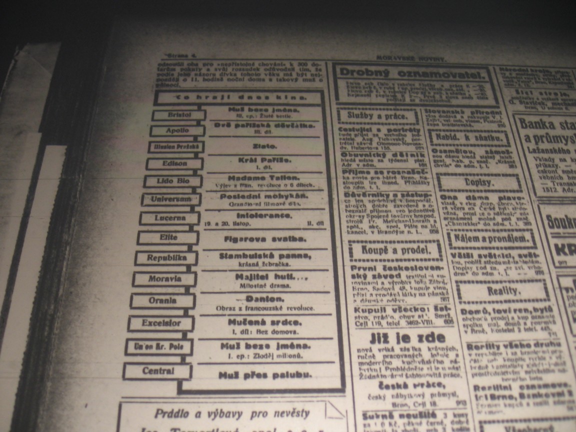| Programme publishing date | 1921-11-19: Moravské noviny | 1921-11-19 | 265 | 100 |