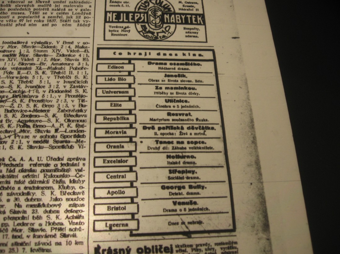 | Programme publishing date | 1922-02-08: Moravské noviny | 1922-02-08 | 30 | 100 |