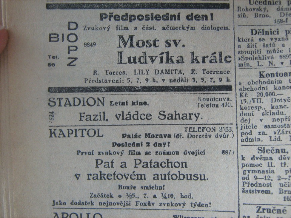 | Programme Description (CZ) | Dnes poslední den! Začátek o 1/2 5., 7., 1/4 10. hod. : Lidové noviny | 1930-07-10 | 343 | 100 |