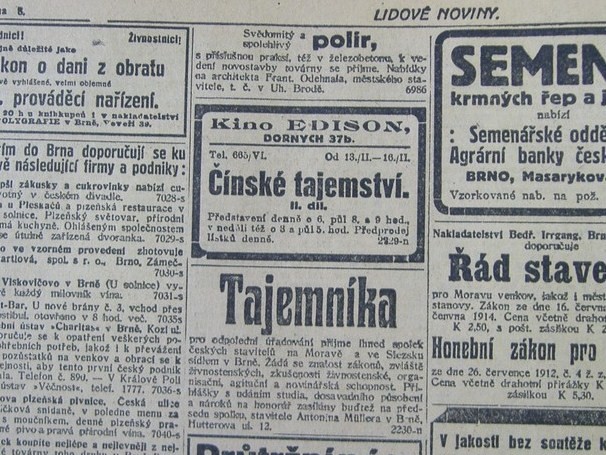 | Programme Description (CZ) | Tel. 665/VI. Představení denně o 6, půl 8. a 9 hod., v neděli též o 3 a půl 5. hod. Předprodej lístků denně.: Lidové noviny | 1920-02-13 | 77 | 100 |