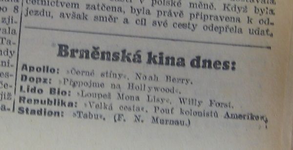| Cinema | Moravské slovo | 1931-10-30 | 252 | 100 |