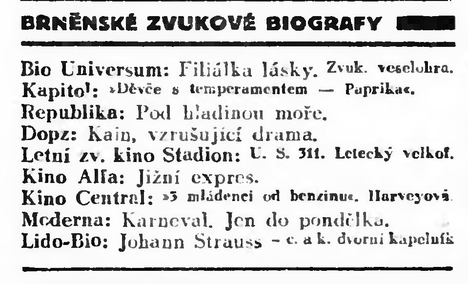 | Cinema | Moravské slovo | 1933-07-08 | 130 | 100 |
