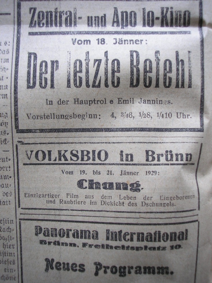 Čas; Apollo-Kino; O. P. Aktualitätenkino; Aktualita; Ufa OP – kino aktualit; Ohne Pause (OP Kino); Apollo: 18.01.1929