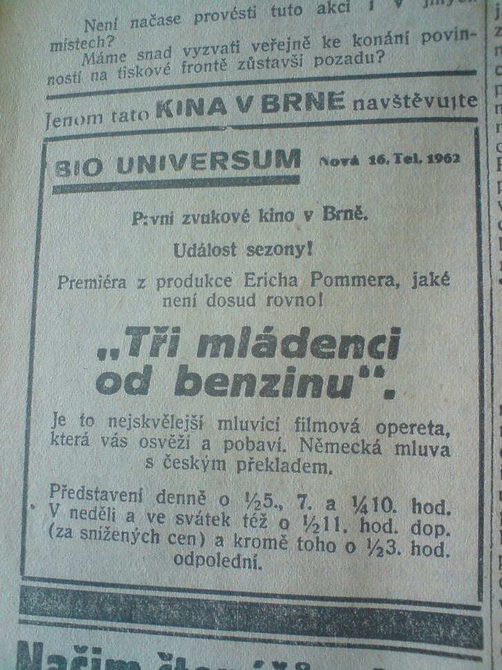 | Numbers | 3 mládenci od benzinu; Tři mládenci od benzinu! ; Tři mládenci od benzínu; Tři mládenci od benzinu / Drei von der Tankstelle; Drei von der Tankstelle!, Die: Volksfreund | 1930-12-19 | 297 | 100 |