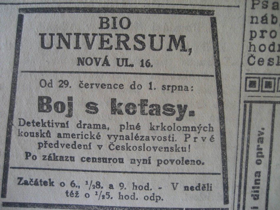 Začátek o 6., půl 8. a 9. h. V neděli též o 3. a půl 5. h. odp.