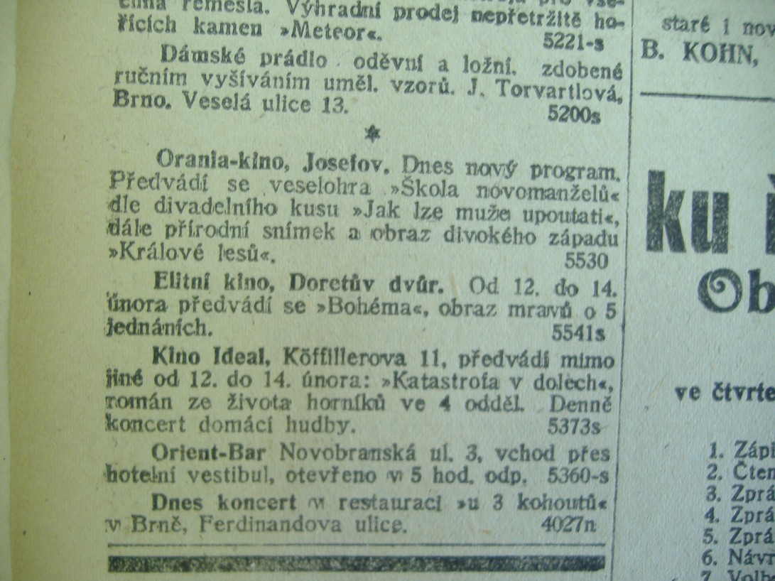 Kino "Ideal" v Brně, Köffillerova ul. čís. 11, předvádí mimo jiné od 12. do 14. února: "Katastrofa v dolech", román ze života horníků ve 4 dílech. Denně koncert salonní kapely.