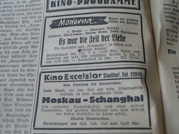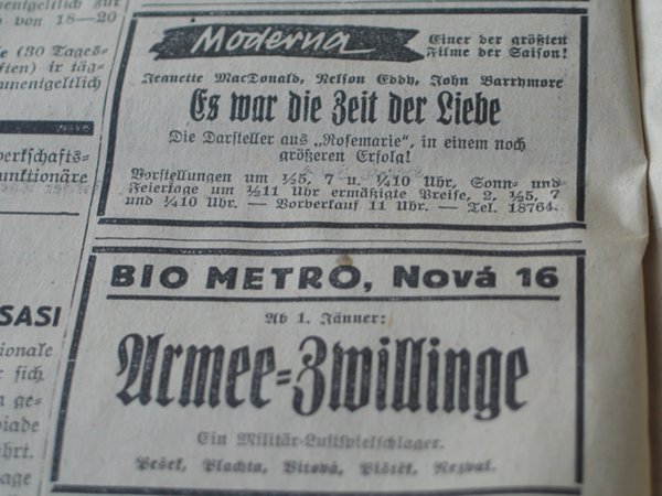 | Programme Description (DE) | Vorstellungen um 1/2 5, 7 und 1/4 10 Uhr, Sonn- und Feiertage um 1/2 11 Uhr ermässigte Preise, 2, 1/2 5, 7, und 1/4 10 Uhr. - Vorferkauf 11 Uhr. - Tel. 18764: Volksfreund | 1938-01-01 | 1 | 100 |