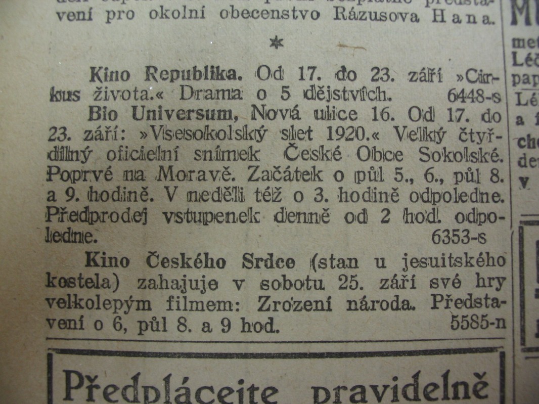 Kiko Českého srdce (stan u jesuitského kostela) zahajuje v sobotu 25. září své hry velkolepým filmem: Zrození národa. Představení o 6, půl 8. a 9 hod.