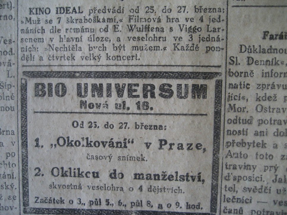 | Programme Description (CZ) | Začátek o půl 5., 6., půl 8. a 9. hod. Dnes v úterý též o 3 hod. odp.: Lidové noviny | 1919-03-25 | 84 | 100 |