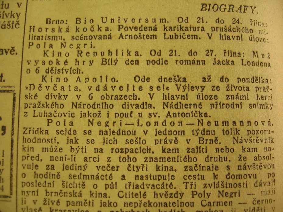 | Programme publishing date | 1921-10-25: Moravské noviny | 1921-10-25 | 245 | 100 |