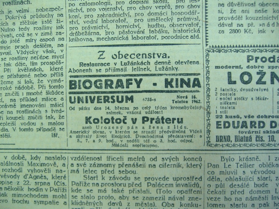 | Programme Description (CZ) | Od pátku dne 14. března po celý týden. Dvouhodinná představení o 5., 7. a 9. hod. V neděli též o 3. hod. odpoledne. Mládeži nepřístupno.: Lidové noviny | 1924-03-14 | 135 | 100 |