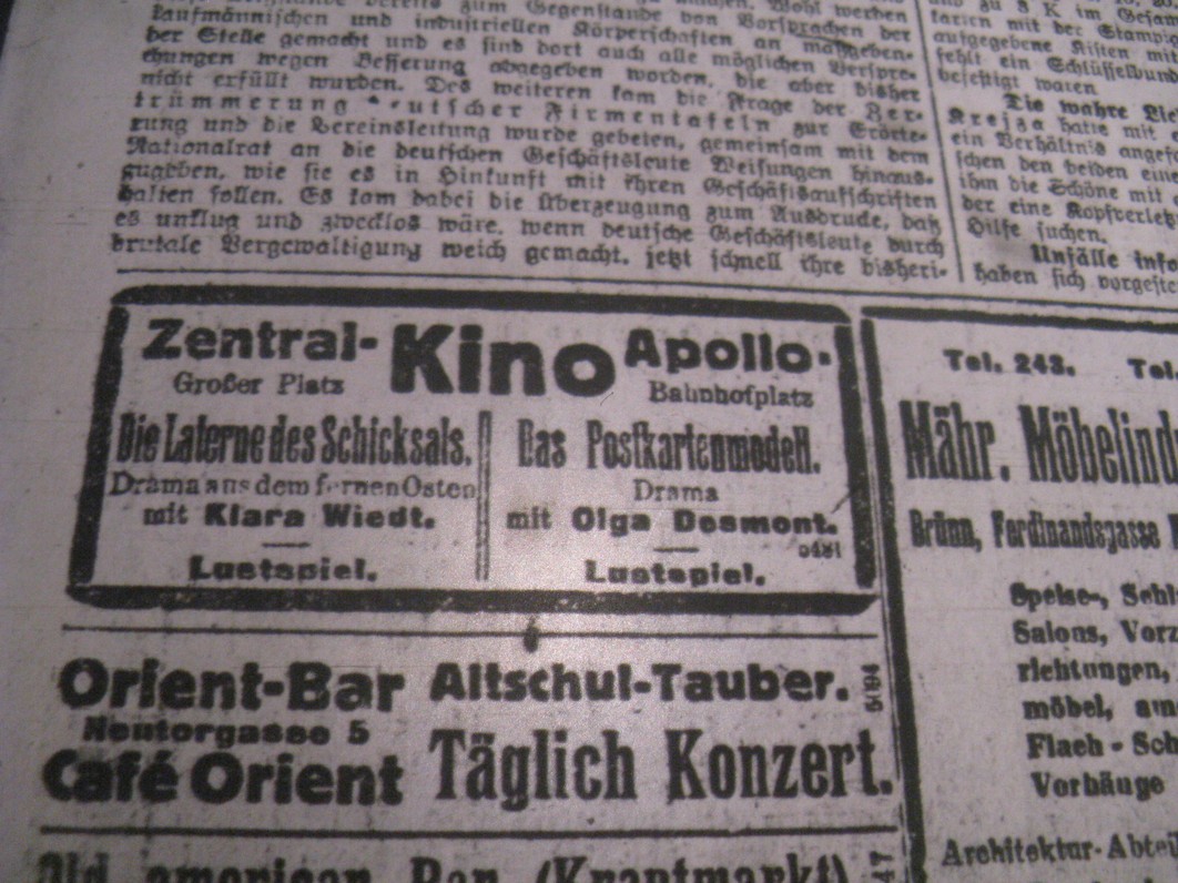| Programme publishing date | 1918-12-29: Tagesbote aus Mähren und Schlesien | 1918-12-29 | 607 | 100 |