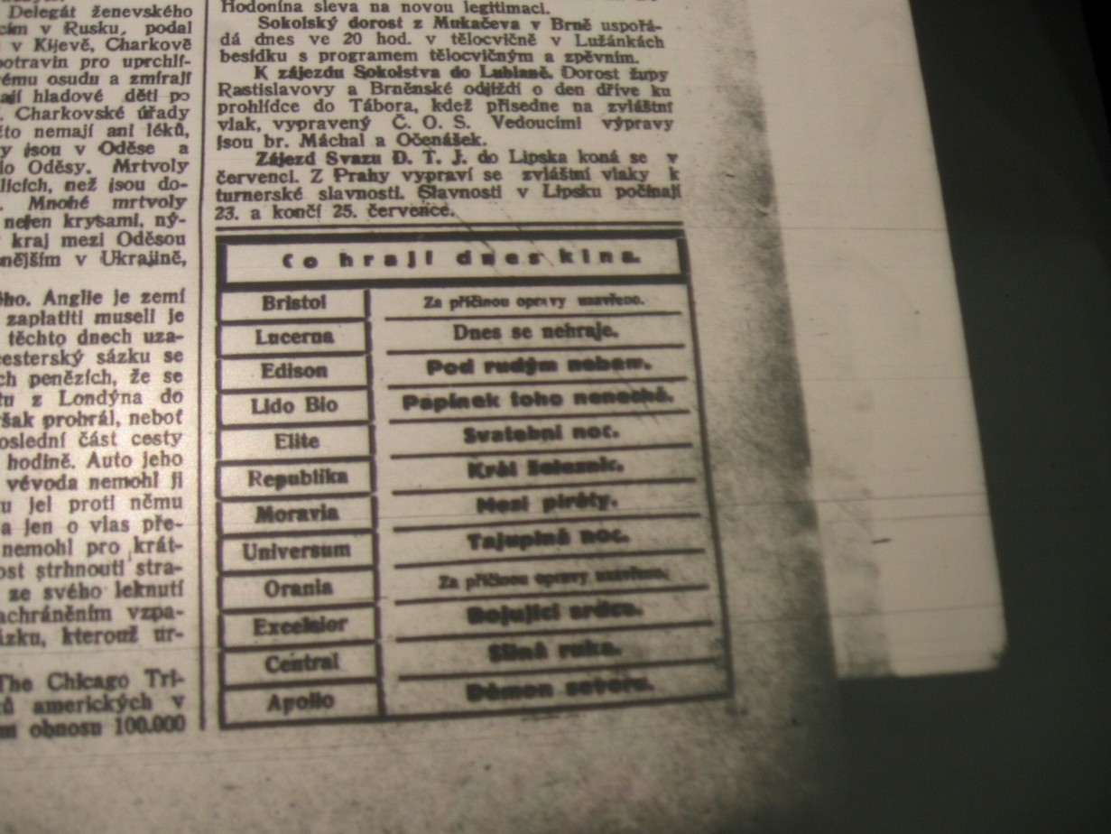 | Dny promítání (do) | Moravské noviny | 1922-07-18 | 159 | 100 |