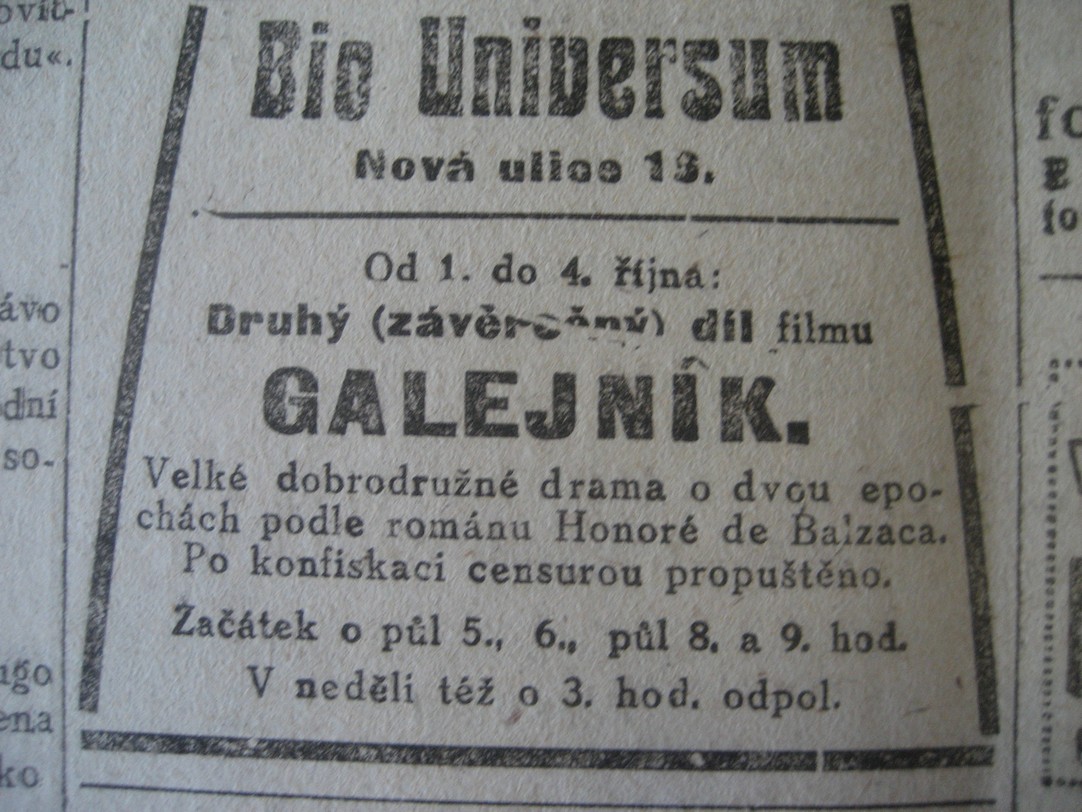Mládež nemá přístup. Začátek o půl 5., 6., půl 8. a 9. hod. V neděli též o 3. hod. odpol.