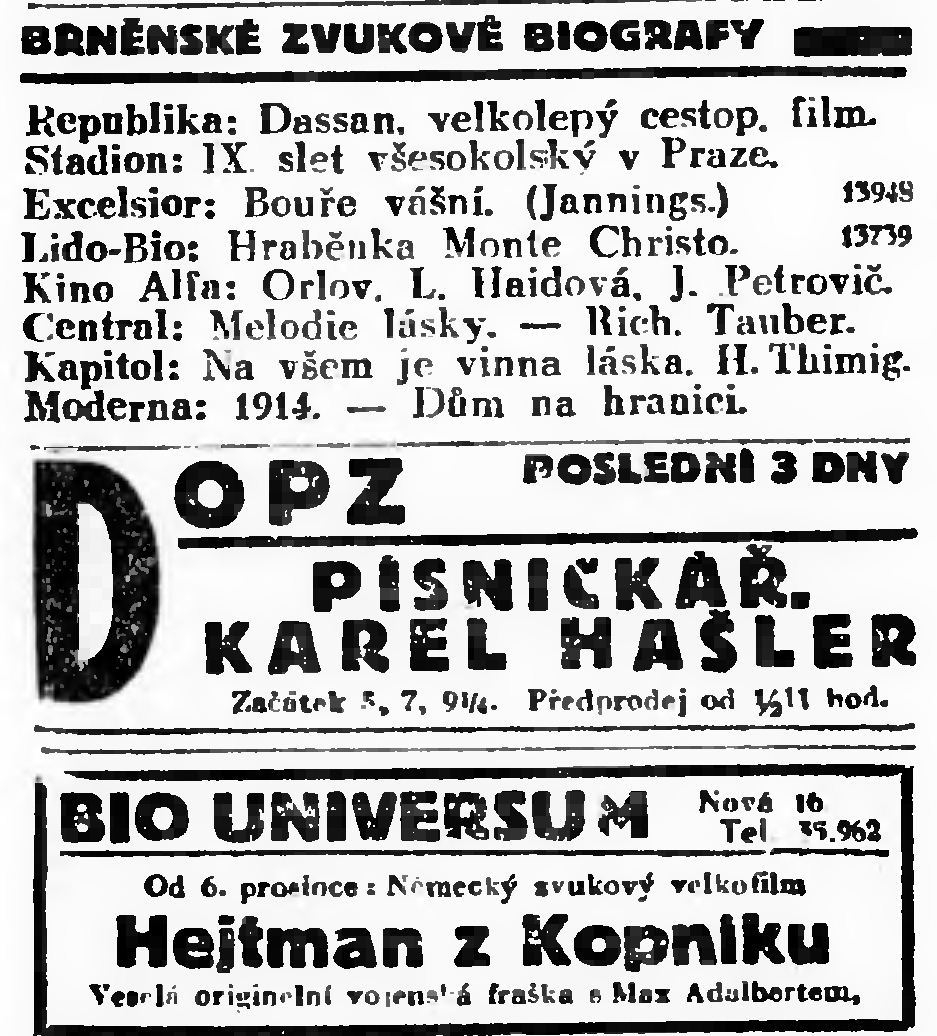 | Dny promítání (od) | 1932-12-06: Lidové noviny | 1932-12-06 | 616 | 100 |