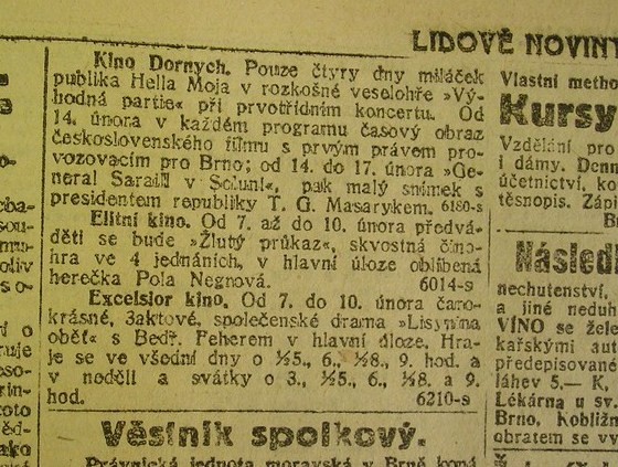 - 396(1908)550(1927)Special noteOd 14. února v každém programu časový obraz československého filmu s prvým právem provozovacím pro Brno.District