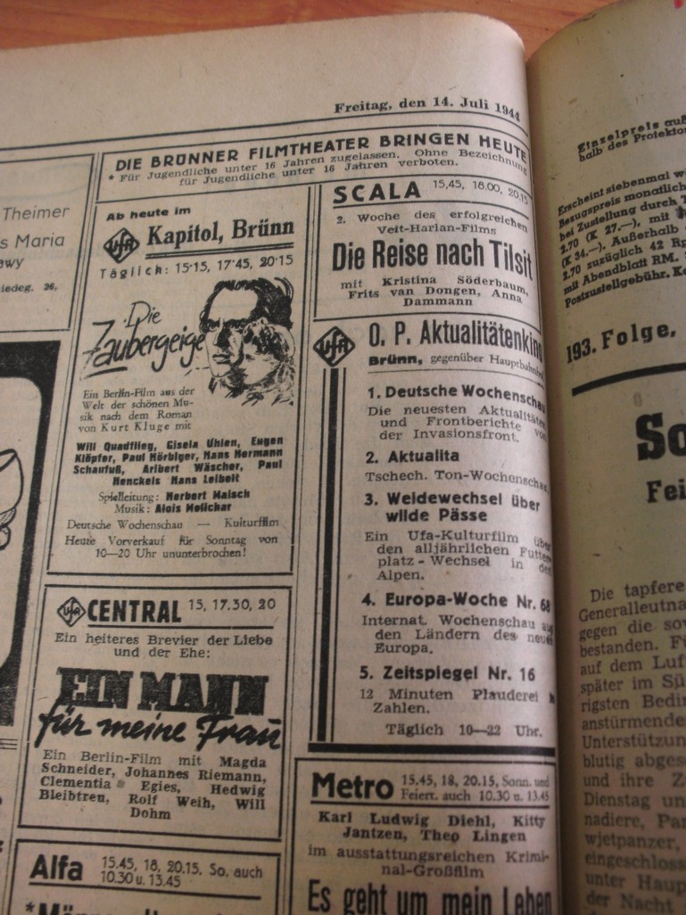 | Programme Description (DE) | Ab heute. Täglich 15.15, 17.45, 20.15.: Brünner Abendblatt | 1944-07-14 | 100 | |