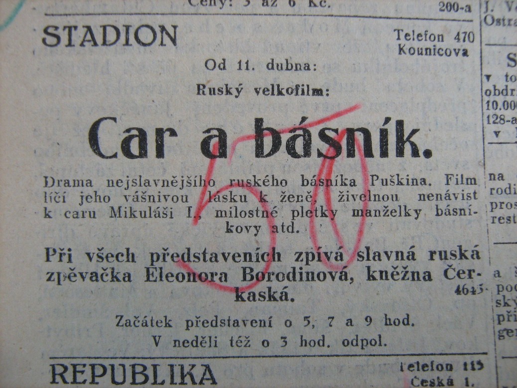 | Programme Description (CZ) | Od 11. dubna Při všech představeních zpívá slavná ruská zpěvačka Eleonora Borodinová, kněžna Čerkaská. Začátek představení o 5, 7 a 9 hod. V neděli též o 3 hod. odpol. : Lidové noviny | 1930-04-11 | 186 | 100 |