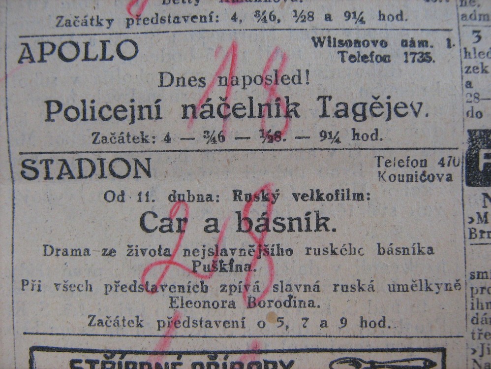 | Programme Description (CZ) | Od 11. dubna Při všech představeních zpívá slavná ruská umělkyně Eleonora Borodina. Začátek představení o 5, 7 a 9 hod.: Lidové noviny | 1930-04-14 | 191 | 100 |
