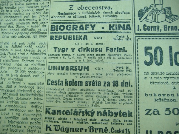 Nový sensační Universalfilm a jeho první předvedení v Československu. Druhá epocha od 1. do 3. dubna. Jako dodatek dva zajímavé snímky: Pohřeb Leninův a pohřeb generála Pellé.