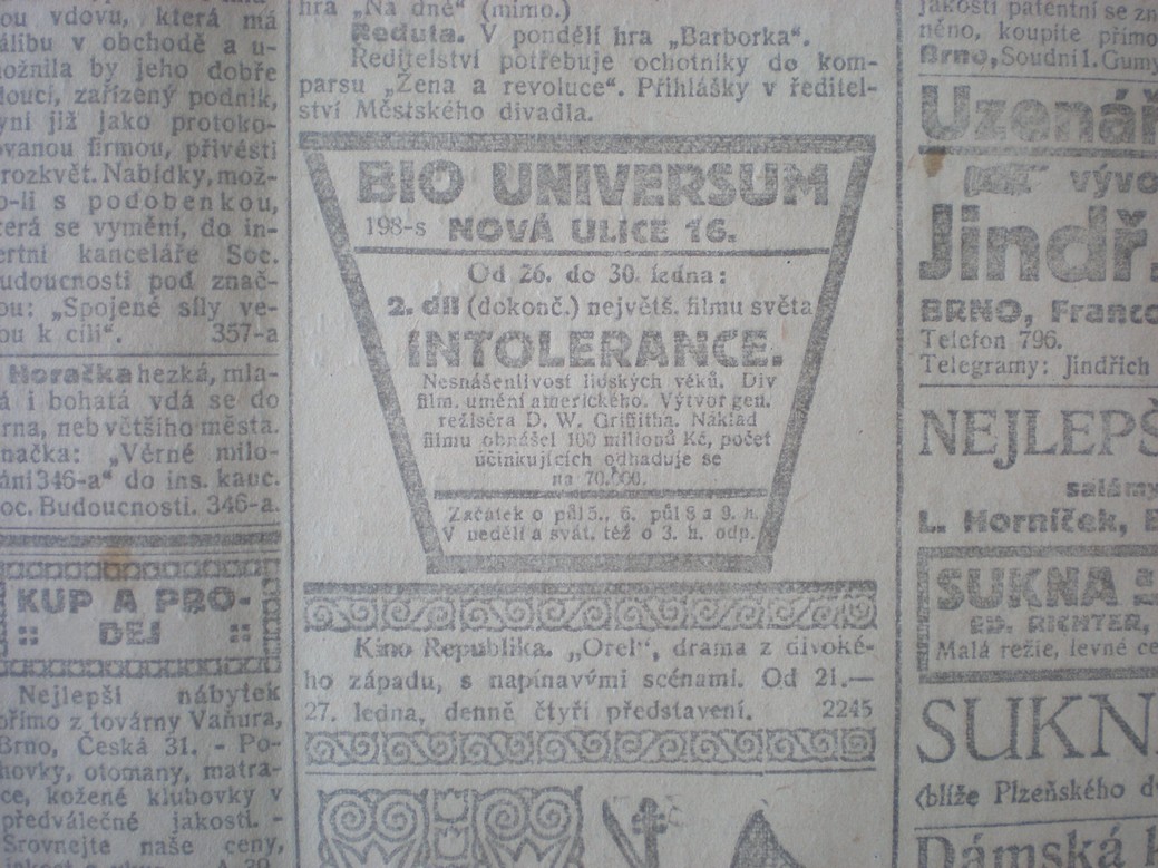 | Programme Description (CZ) | 1. díl 21.-25. ledna. II. díl 26.-30. ledna. Zaopatřete si vstupenky v předprodeji.: Lidové noviny | 1921-01-18 | 29 | 100 |