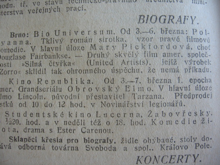 | Programme publishing date | 1922-03-03: Moravské noviny | 1922-03-03 | 50 | 100 |