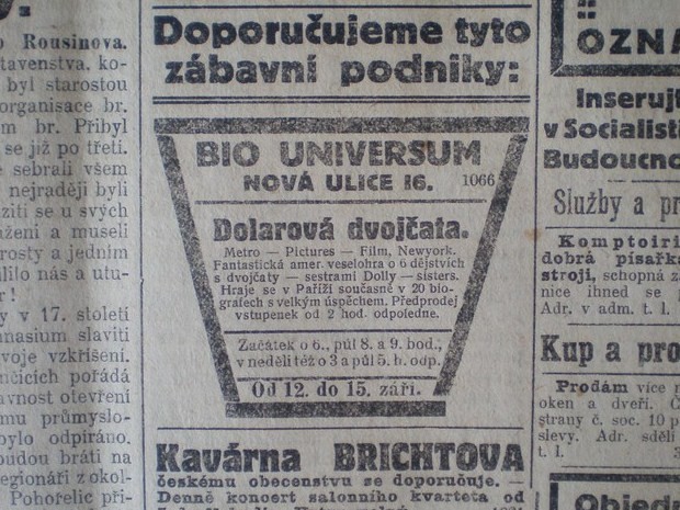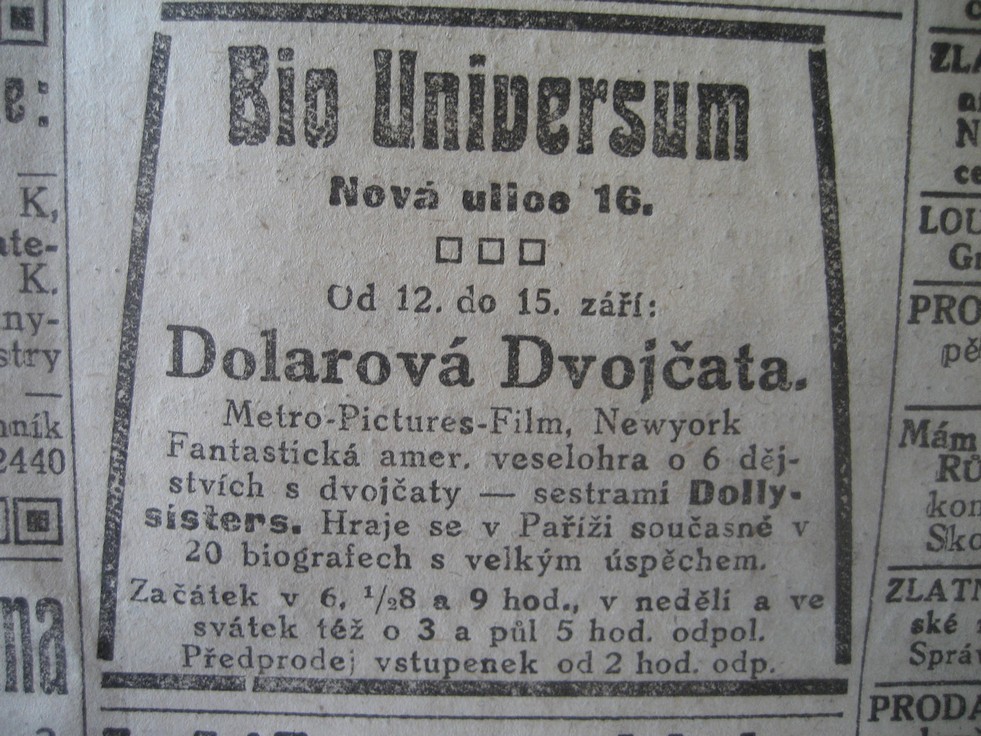 Začátek o 6, půl 8. a 9 hod., v neděli též o 3 a půl 5. hod. odpol. Předprodej vstupenek od 2 hod. odpol.