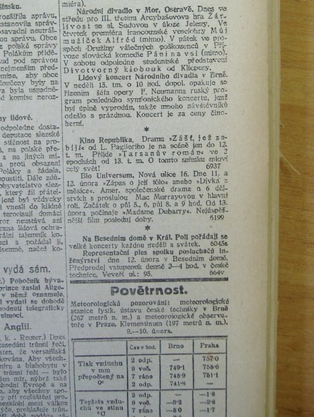 | Programme Description (CZ) | Začátek o půl 5., 6, půl 8. a 9 hod.: Lidové noviny | 1920-02-11 | 73 | 100 |