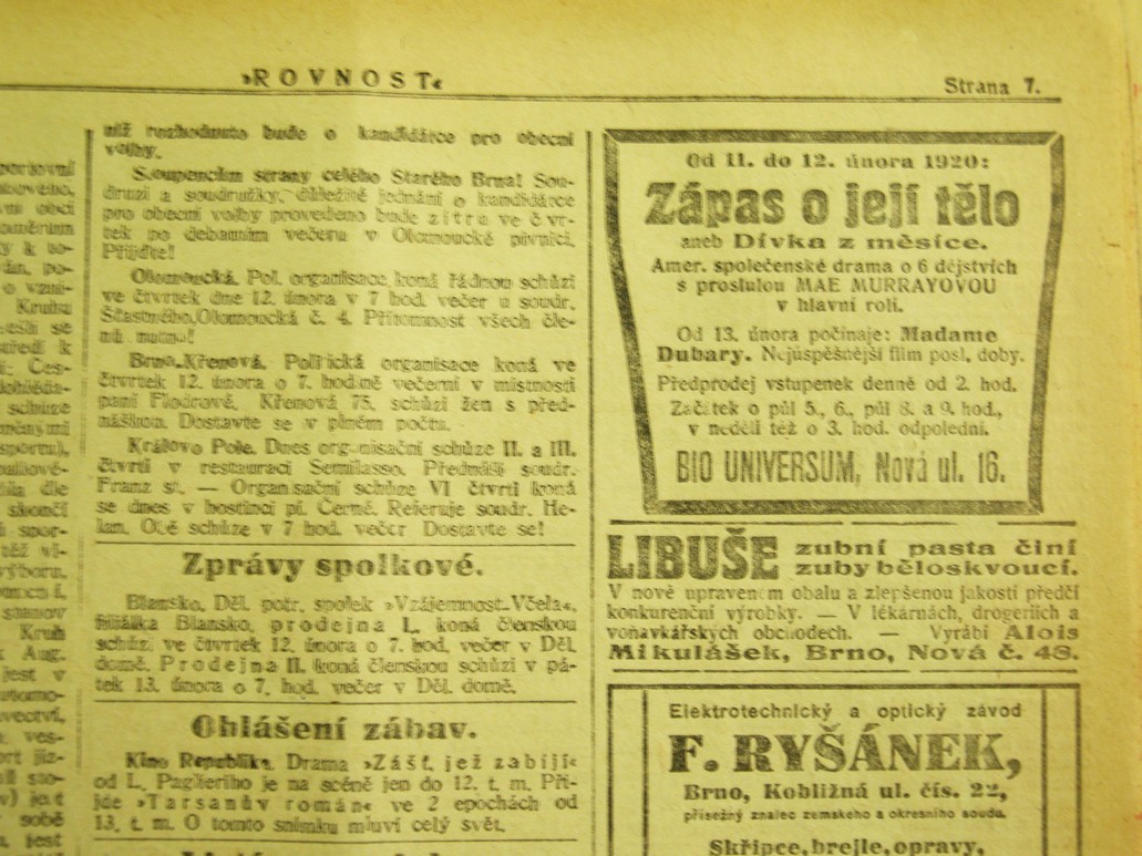| Programme Description (CZ) | Předprodej vstupenek denně od 2. hod. Začátek o půl 5., 6., půl 8. a 9. hod., v neděli též o 3. hod. odpolední.: Rovnost | 1920-02-11 | 42 | 100 |