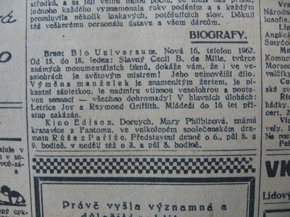 | Cinema | Moravské noviny | 1926-01-16 | 11 | 100 |