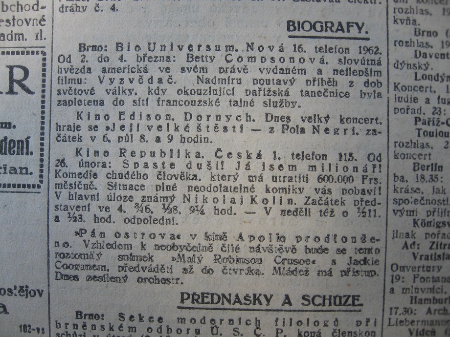 | Programme publishing date | 1926-03-03: Moravské noviny | 1926-03-03 | 50 | 100 |