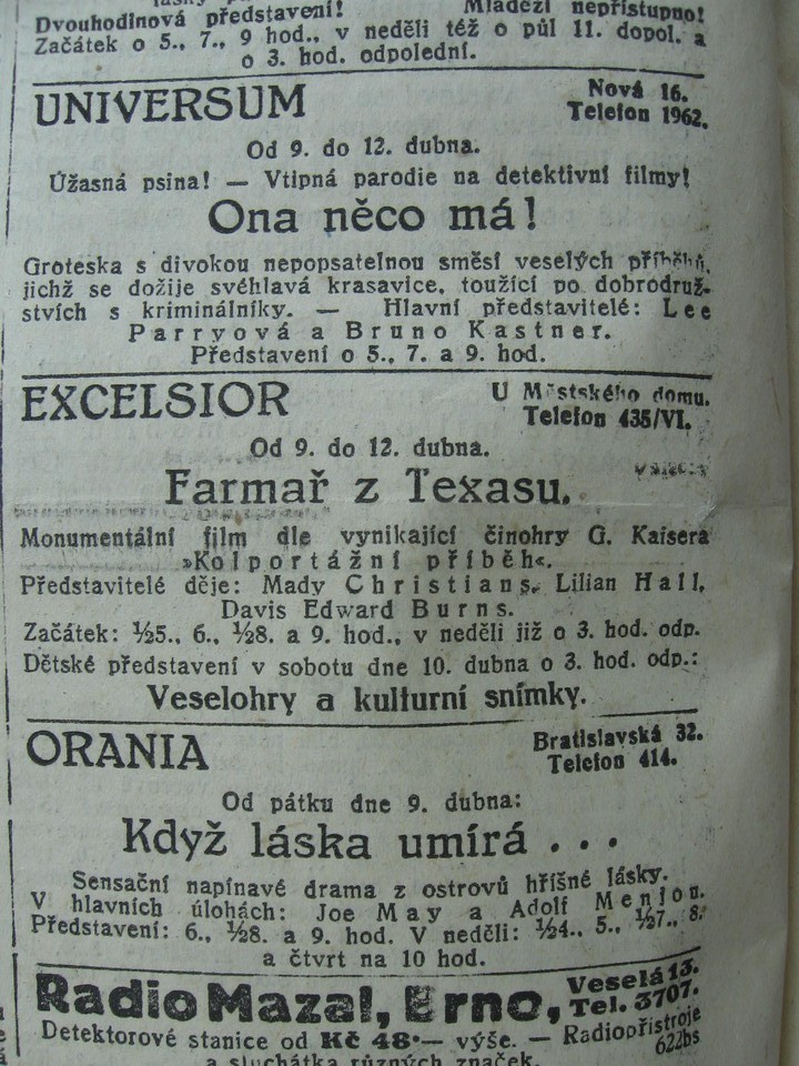 | Cinema | Moravské noviny | 1926-04-10 | 83 | 100 |