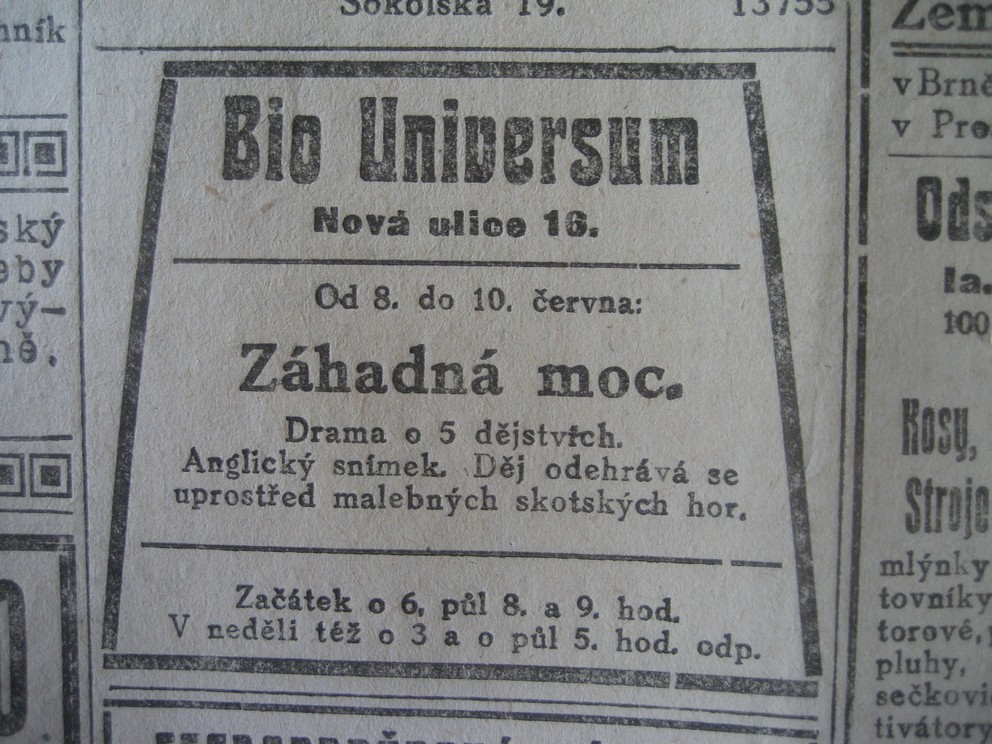 Začátek o 6, půl 8. a 9 hod. V neděli též o 3 a půl 5. hod. odpoledne.
