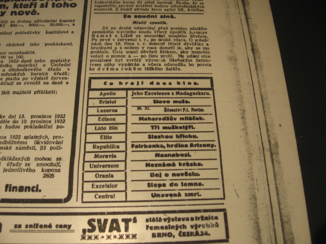 | Cinema | Moravské noviny | 1922-11-29 | 270 | 100 |