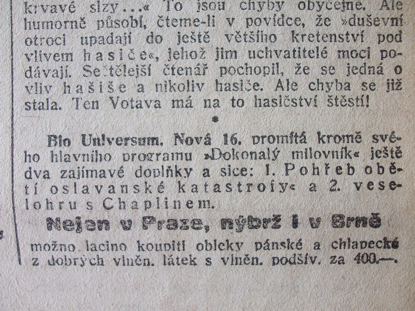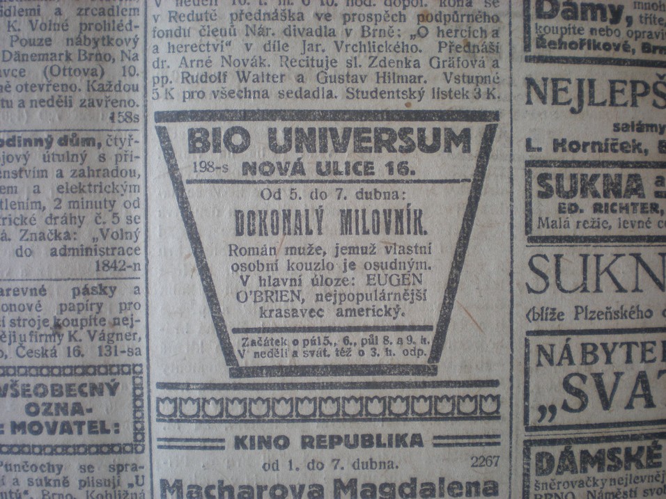 | Programme Description (CZ) | Bio Universum promítá kromě svého hlavního programu "Dokonalý milovník" ještě dva zajímavé doplňky.: Lidové noviny | 1921-04-06 | 169 | 100 |