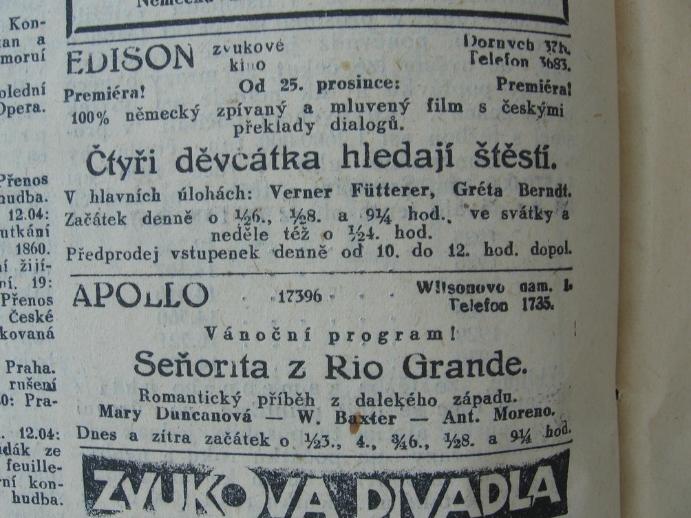 | Programme Description (CZ) | Premiéra! Od 25. prosince: Premiéra! Začátek denně o 1/2 6., 1/2 8. a 9 1/4 hod., ve svátky a neděle též o 1/2 4. hod. Předprodej vstupenek denně od 10. do 12. hod. dopol. : Lidové noviny | 1930-12-25 | 648 | 100 |