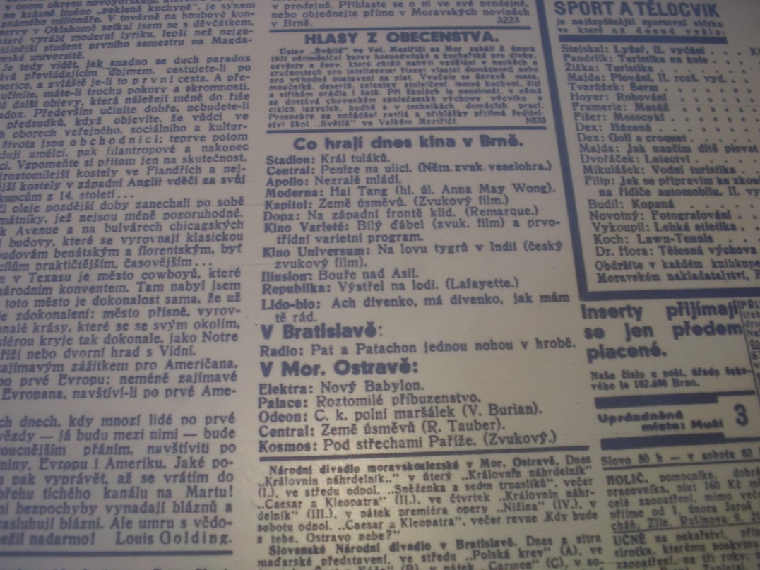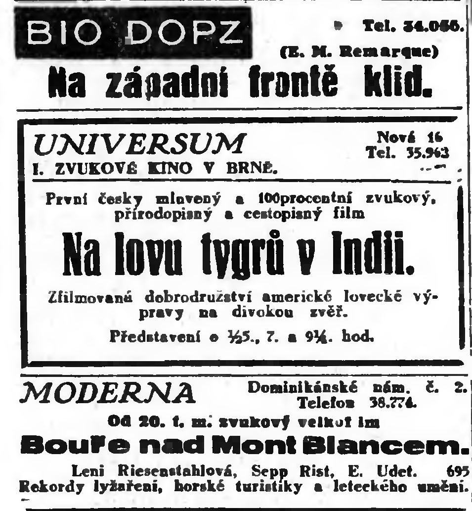 | Number of screenings | 24: Moravské noviny | 1931-01-19 | 15 | 50 |