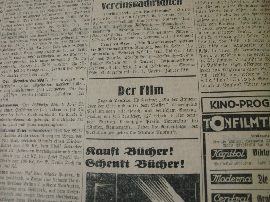Freitag um 1/4 5 deutscher, 1/4 7 tschech., 8 Uhr deutscher Vortrag. Ermäßigte Preise. Vorverkauf bei Winkler, Rennergasse. Ueber die Reihenfolge von Vorführungen geben die Plakate Auskunst.
