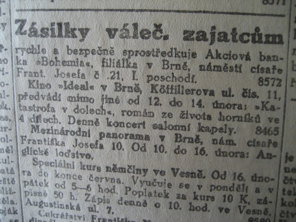 Kino "Ideal" v Brně, Köffillerova ul. čís. 11, předvádí mimo jiné od 12. do 14. února: "Katastrofa v dolech", román ze života horníků ve 4 dílech. Denně koncert salonní kapely.