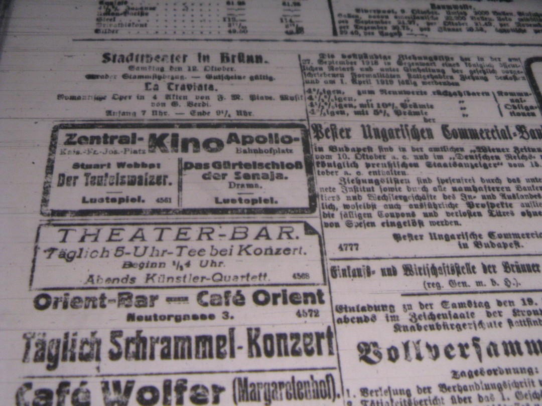 | Programme publishing date | 1918-10-12: Tagesbote aus Mähren und Schlesien | 1918-10-12 | 477 | 100 |