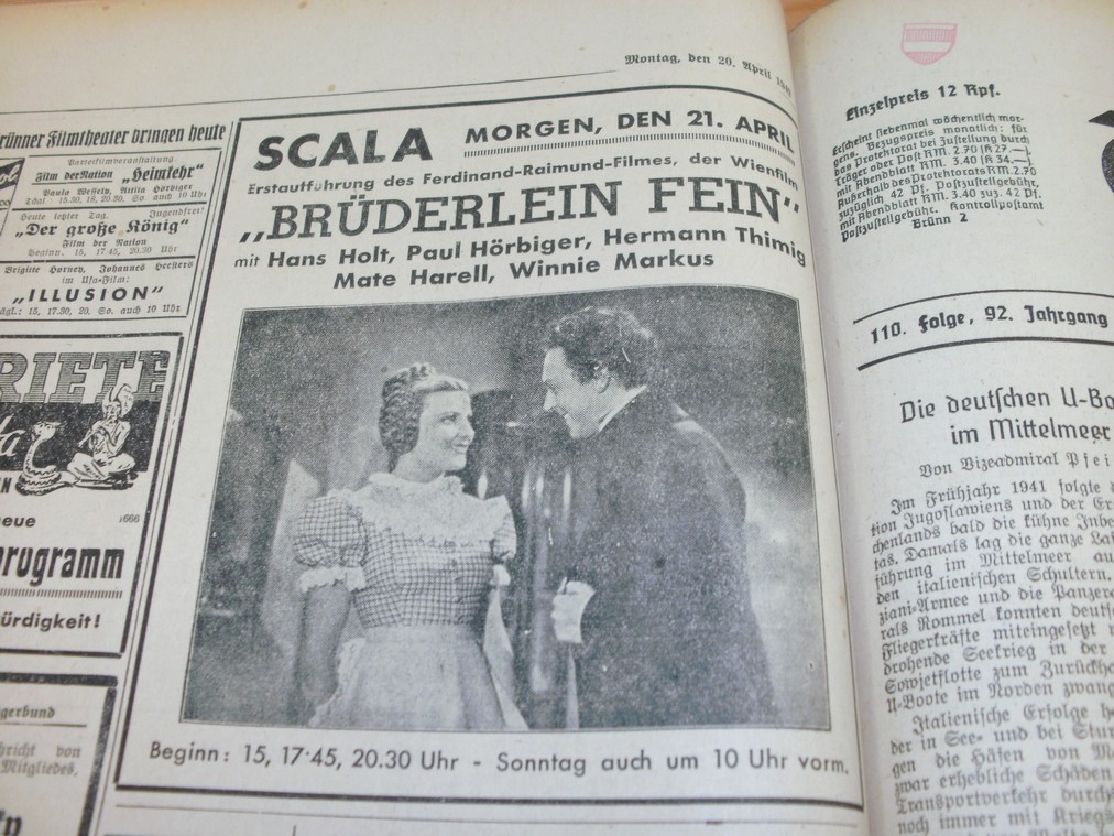 | Programme Description (DE) | Morgen, den 21. April Erstaufführung. 15, 17.45, 20.30, So auch 10.: Brünner Abendblatt | 1942-04-20 | 100 | |