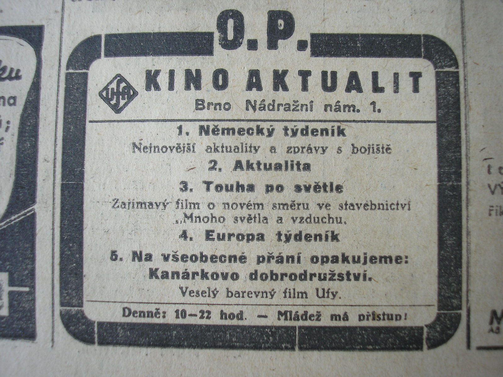 1. Německý týdeník - nejnovější aktuality a zprávy s bojiště. 2. Aktualita. 3. Touha po světle - Zajímavý film o novém směru ve stavebnictví. Mnoho světla a vzduchu. 4. Europa týdeník. 5. Na všeobecné přání opakujeme: Kanárkovo dobrodružství. Veselý barevný film Ufy. Denně 10-22 hod.