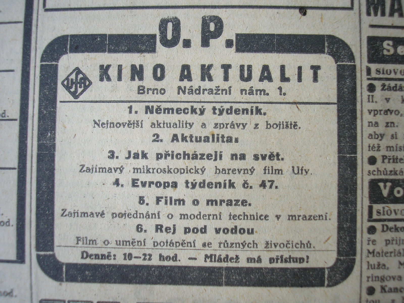 1. Německý týdeník. Nejnovější aktuality a zprávy z bojiště. 2. Aktualita. 3. Jak přicházejí na svět. Zajímavý mikroskopický barevný film Ufy. 4. Evropa týdeník č. 47. 5. Film o mraze. Zajímavé pojednání o moderní technice v mrazení. ž. Rej pod vodou. Film o umění potápění se různých živočichů. Denně: 10-22 hod.