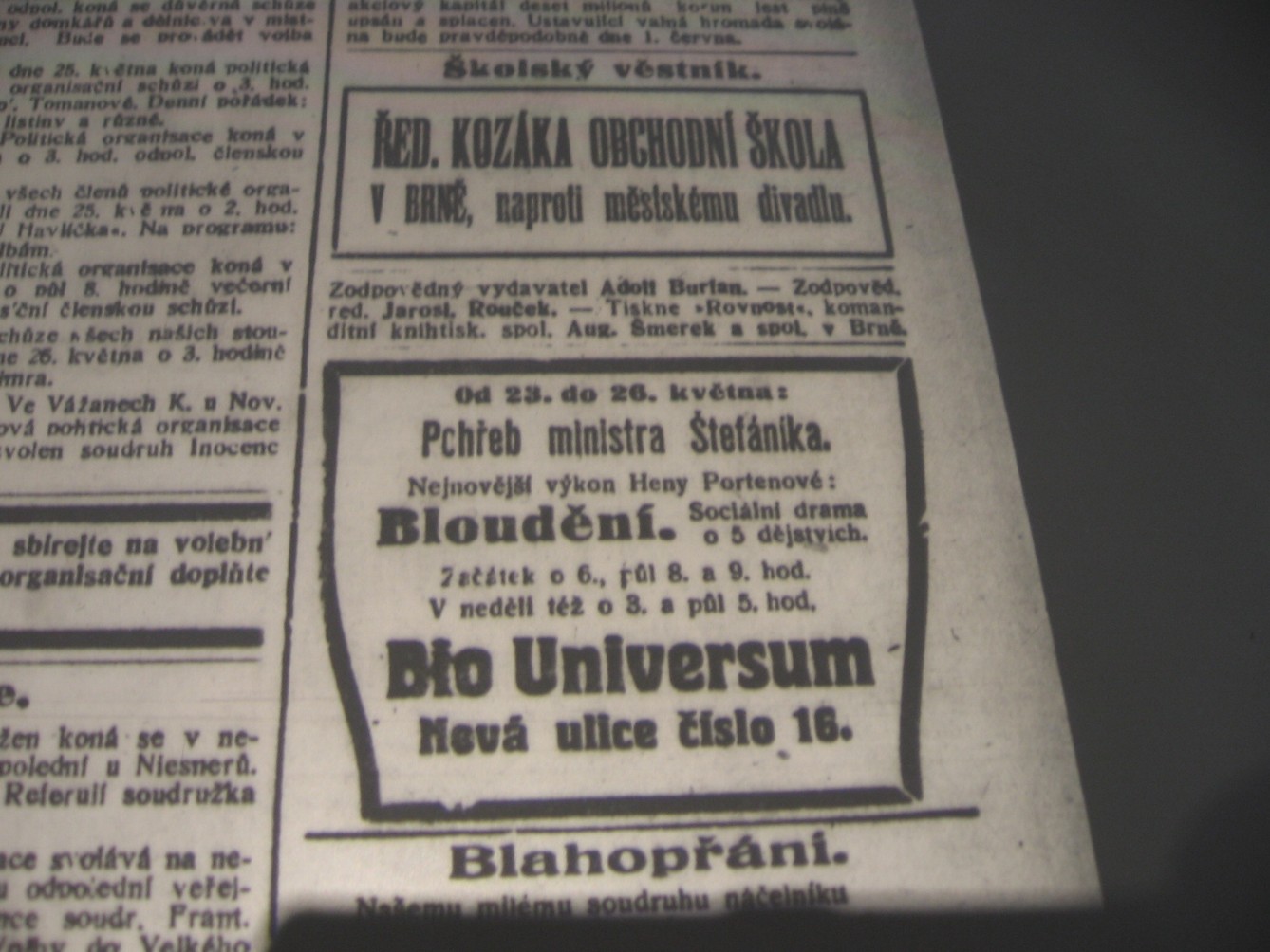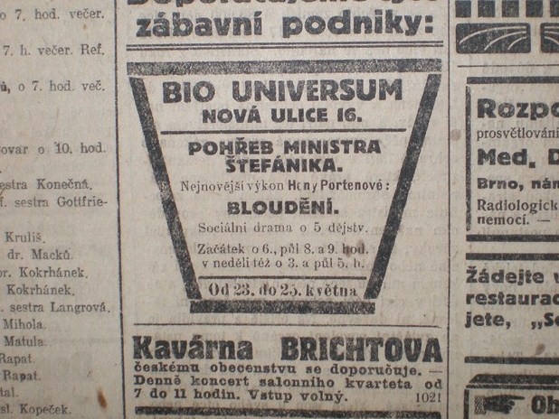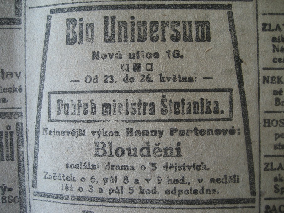 Bio Universum má v nynějším programu velice časový snímek "Pohřeb ministra Štefánika", znázorňující obřady a pohřební průvody v Bratislavi, v Košariskách a na Bradle. Co však naše čtenáře bude stejně zajímati, je sociální drama "Bloudění", jež tvoří hlavní část programu a jehož napínavý děj obsahuje krásně sehrané scény ze života dělnictva továrního. Hlavní úlohu v tomto časovém dramatu hraje proslulá a všeobecně oblíbená kinoherečka Heny Portenová.