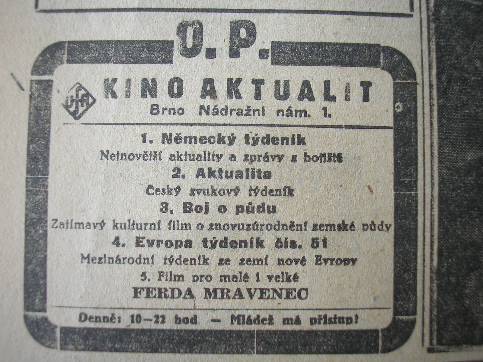 1. Deutsche Wochenschau. Die neuesten Aktualitäten und Frontbildberichte. 2. Aktualita. Tschechische Tonbildschau. 3. Kampf um den Boden. Ein interesanter Kulturfilm über die Fruchtbarmachung der Erde. 4. Europa-Woche Nr.51. Internationale Wochenschau aus den Ländern des neuen Europa. 5. Ein Film für gross und klein: Der brave Slim. Täglich 10-22 Uhr