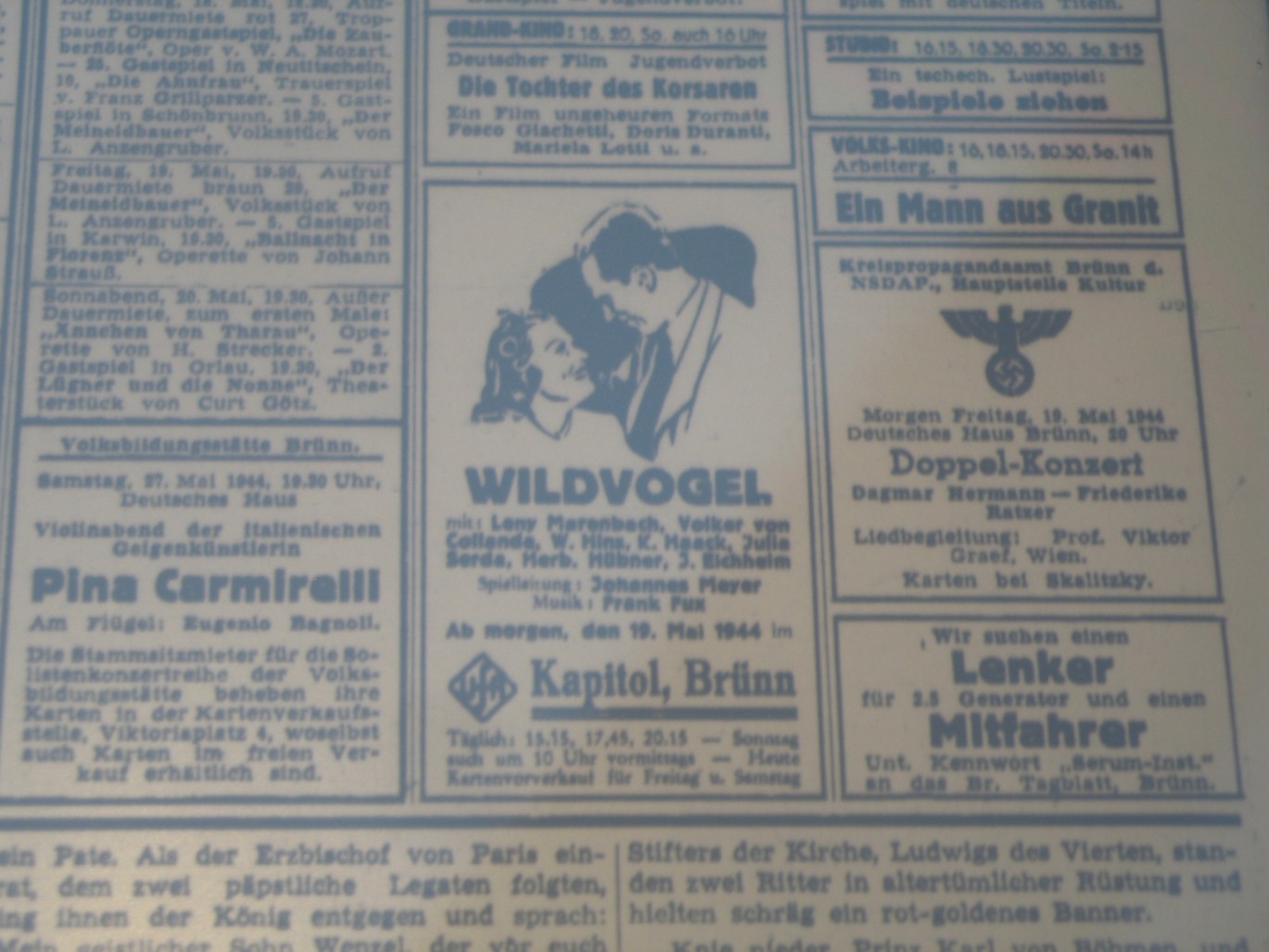 | Programme Description (DE) | ab Freitag, den 19. Mai 1944 im Kapitol. Kartenvorverkauf für Freitag und Samstag ab Donnerstag ununterbrochen von 10-20 Uhr.: Tagesbote aus Mähren und Schlesien | 1944-05-17 | 135 | 100 |