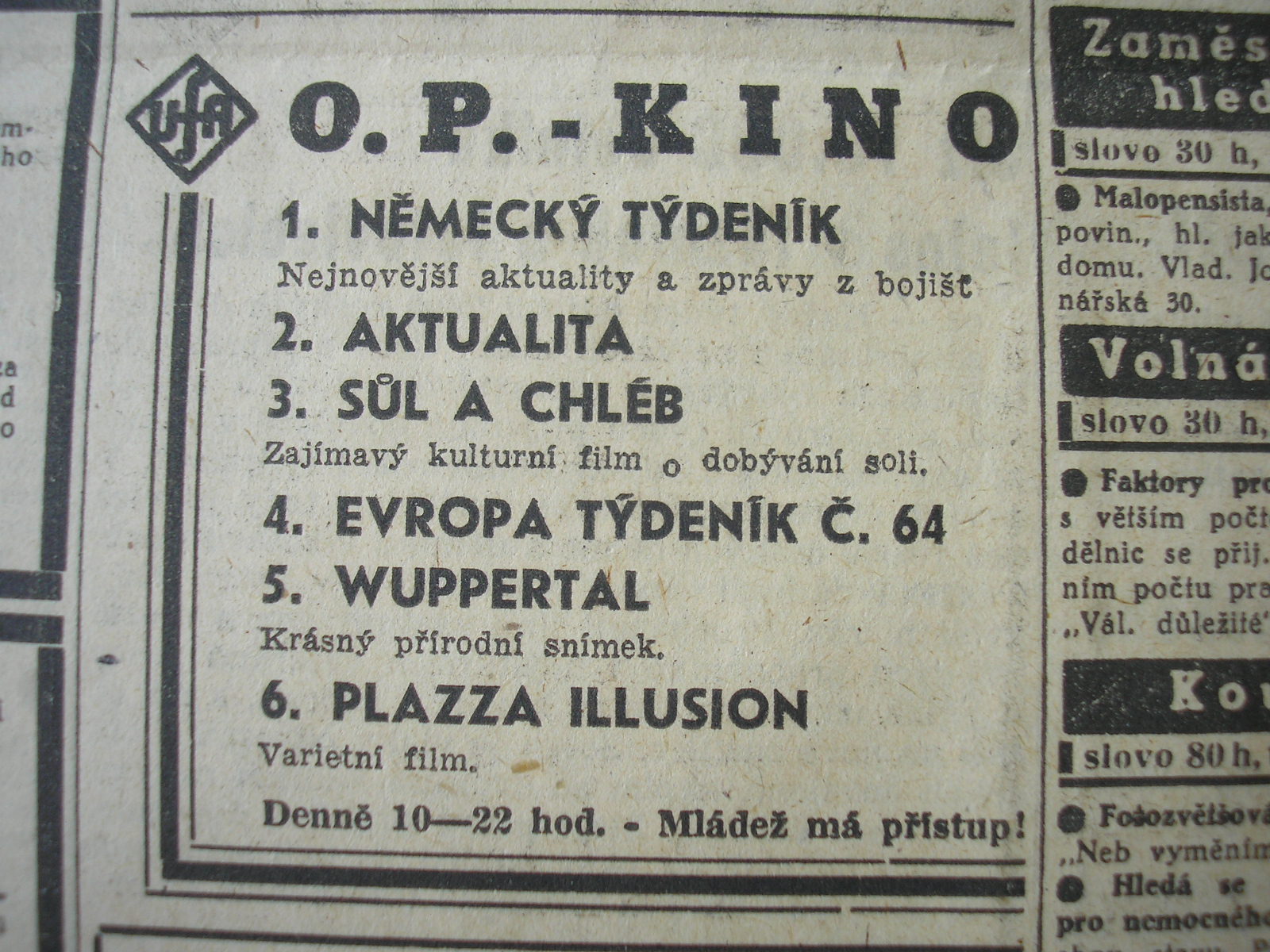 1. Německý týdeník. Nejnovější aktuality a zprávy z bojišť. 2. Aktualita 2. Sůl a chléb. Zajímavý kulturní film o dobývání soli. 4. Evropa týdeník č.64. 5. Wuppertal. Krásný přírodní snímek. 6. Plazza Illusion. Varietní film. Denně 10-22 hod.