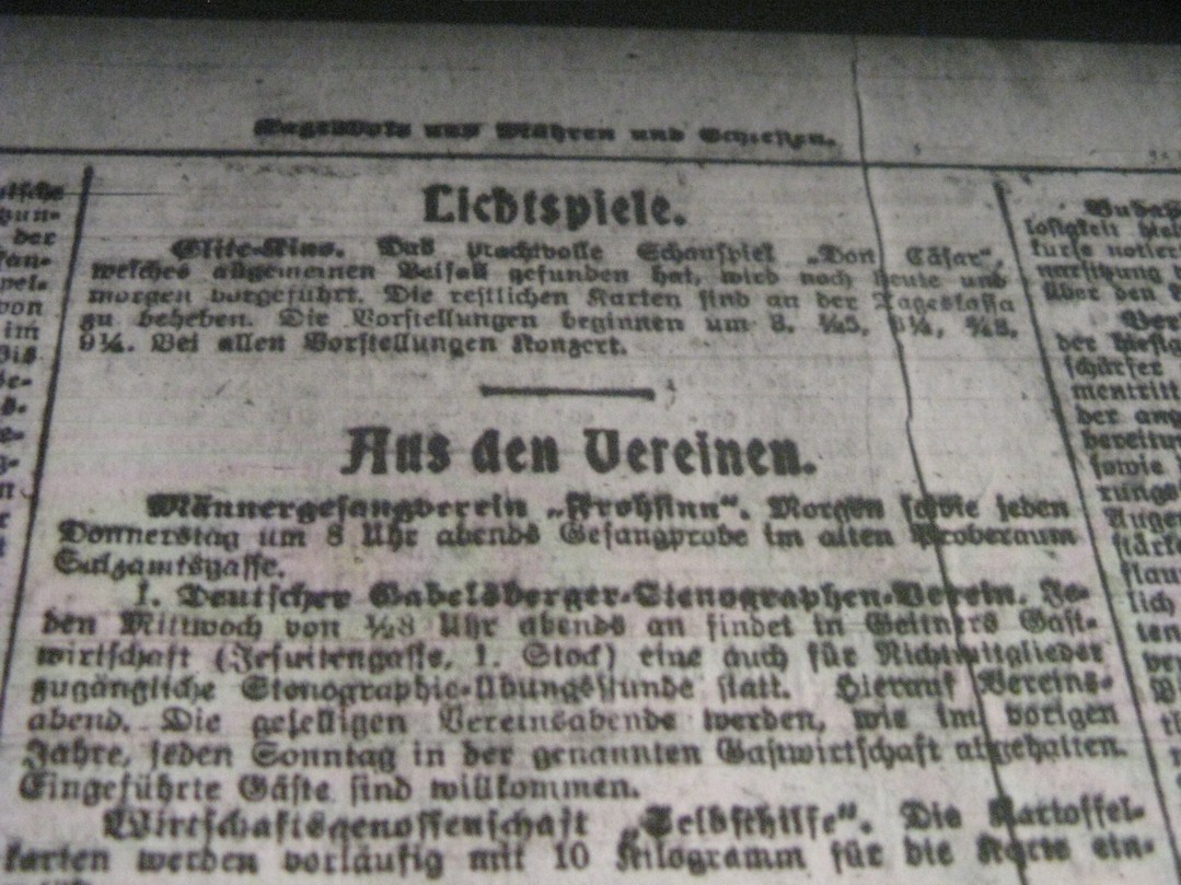 | Programme Description (DE) | Das bereits angekündigte und mit grosser Spannung erwartete Drama mit Max Neufeld und anderen berühmten Wiener Künstlern gelangt ab heute zur Vorführung. Die Vorstellungen beginnen um 3, 1/2 5, 6.15, 3/4 8, 9.30. Bei allen Vorstellungen Konzert: Tagesbote aus Mähren und Schlesien | 1918-11-19 | 540 | 100 |